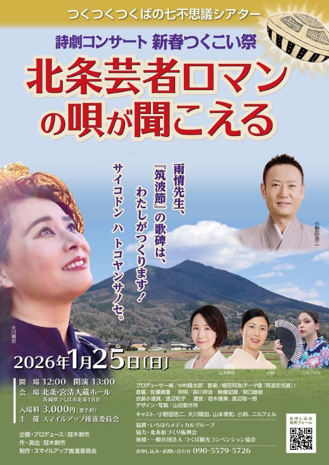 【コラム・冠木新市】今、1月25日に開催する詩劇コンサート「新春つくこい祭/北条芸者ロマンの唄が聞こえる」を準備中だ。これは2012年秋に上演した詩劇「北条芸者ロマン/筑波節を歌う女」を14年ぶりに再演するものである。