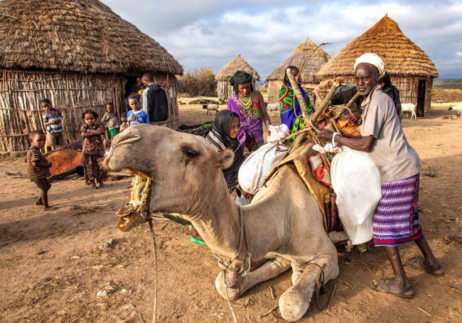 家畜であるラクダに荷物を乗せる、エチオピアのサバンナにあるボラナ村の人々を撮影した。村には井戸などがなく水がないため、1日の水分は朝のラクダの乳で作ったミルクティー2杯のみだった。数日間、わらぶき屋根でできた村人の家に滞在したが、子ヒツジや子ヤギも一緒に寝る環境でダニに悩まされたそうだ。