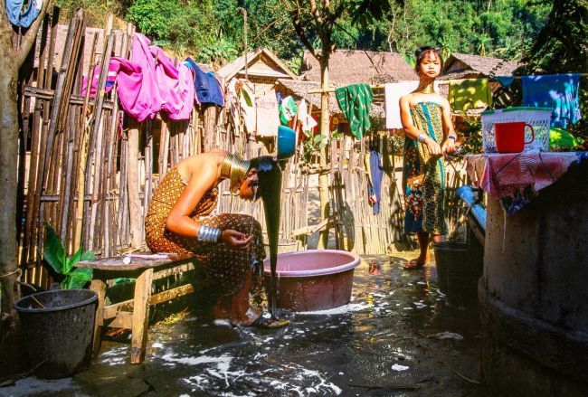 カレン族が住む山岳地域は水が豊富だ。井戸端で水をたっぷり使いながら髪を洗う女性の姿と横にたたずむ少女の対比が印象的で撮影した。幼い頃から首に巻いた真鍮のリングは、一生外すことができないそうだ。