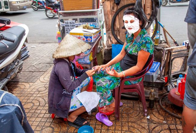 ベトナムに住む華僑の女性が、街角で美容サロンを開いていたところを撮影。屋根もない店舗だが、マニキュアを施術されている女性は顔にパック剤をつけて満足気に微笑んでいた。女性のたくましさに感心したという。
