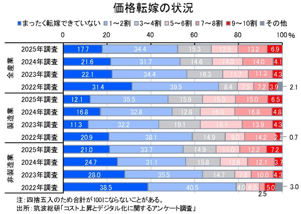 コスト上昇を販売・サービス価格に転嫁できたかとの質問には、「1~2割転嫁できた」と回答した会社が34.4%と最も多く、「まったく転嫁できていない」会社が17.7%あった。