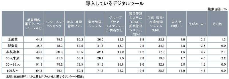 デジタル化の内容については、「インターネットバンキング」が一番多く(全産業で79.5%)、「給与管理ソフト」(同65.3%)、「紙書類の電子化・ペーパーレス化」(同44.2)の順だった。