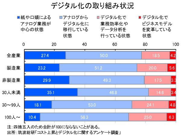 筑波総研は同時に「デジタル化の取り組み状況」も調査した。それによると、デジタル化を進めている会社が7割強を占めたものの、依然としてアナログな業務が多いと回答した会社が3割弱あった。「デジタル化は従業員規模が大きい会社ほど進んでいる。だが、その経費の負担や担当人材の不足が課題になっている」と言う。