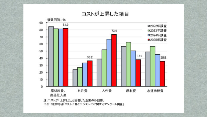 筑波銀行グループの筑波総研(本社土浦市、瀬尾達朗社長)は9月、同行取引先334社(製造業122社、非製造業212社)を対象に今年の経営コスト動向を調査し10月上旬に集計した。それによると、人件費が上昇したと回答した会社が73.4%に達した。1年前の調査に比べ増えており、原材料費・商品仕入高上昇(81.9%)などのほか、人件費増が経営の負担になっていることが改めて明らかになった。