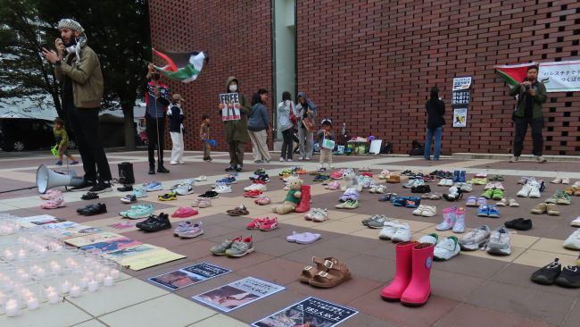 150足の子供の靴は神戸市の疋田香澄さんから送られてきたものだ。疋田さんは、イスラエルによるガザ侵攻で犠牲となったパレスチナ人約6万7000人のうち40%近くが10歳未満の子供であることを表現しようと、SNSで呼び掛け、使わなくなった子供の靴を150足集め、ガザ侵攻から間もなく2年となる10月5日、150足の靴を並べて犠牲者を追悼するイベントを開催した。