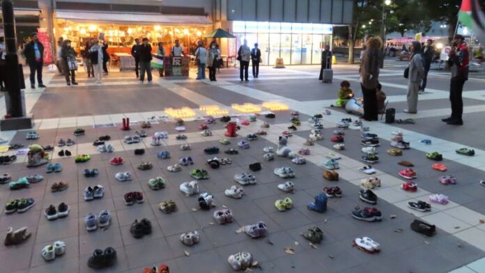 子供の靴150足を並べ、パレスチナのガザ地区で死亡した子供たちを追悼し、イスラエルに抗議する行動が19日、つくば駅前のつくばセンター広場で実施された。抗議行動中の約2時間の間、ガザで死亡した子供たち一人ひとりの名前が読み上げられた。市内外の約40人が参加し、「ガザ虐殺を止めろ」「だれも殺すな」などと書かれた自作のプラカードを掲げたり、通行人にチラシを手渡し「パレスチナに関心をもってほしい」と呼び掛けるなどした。