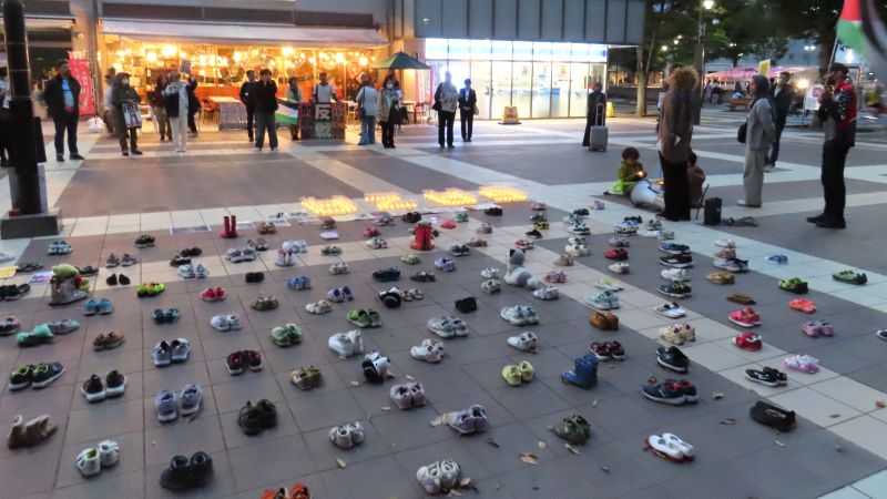 150足の子供の靴は神戸市の疋田香澄さんから送られてきたものだ。疋田さんは、イスラエルによるガザ侵攻で犠牲となったパレスチナ人約6万7000人のうち40%近くが10歳未満の子供であることを表現しようと、SNSで呼び掛け、使わなくなった子供の靴を150足集め、ガザ侵攻から間もなく2年となる10月5日、150足の靴を並べて犠牲者を追悼するイベントを開催した。
