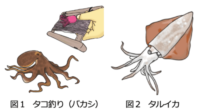 アオリイカは9月中旬から11月まで。道具は竿(さお)とビシ(おもり)のついた糸とバカシです。昼間、船で釣るとイカの真上まで近づけるので見つけやすいとのこと。大きなタルイカ(成体で胴長100センチ、体重20キロを超す)(図2)なら10~12月が漁期です。