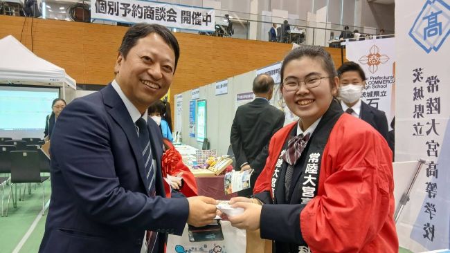商談会には高校生も参加した。県立常陸大宮高校(工藤博幸校長)は授業の一環として、同市の友好都市である秋田県大館市の高校生とともにブレンドコーヒーのドリップパックを開発し、参加者に無料配布した。