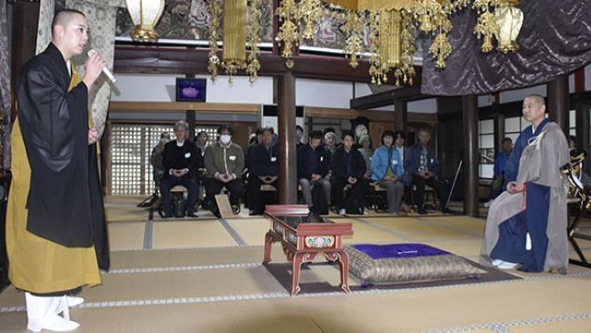 一行は午後、8代孝朝(たかとも)の供養塔がある小田地内の龍勝寺にお参り。座禅と焼香で、先祖を供養する儀式に臨んだ。