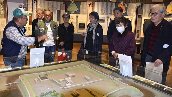 常陸小田城親衛隊の会メンバーから、居城跡近くの案内所で小田城の概要説明を受ける一行