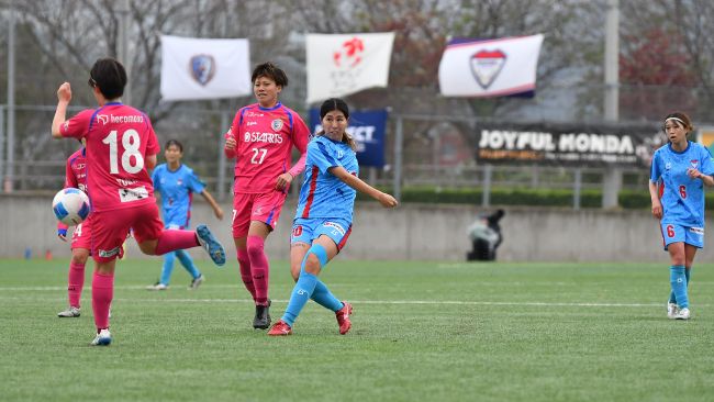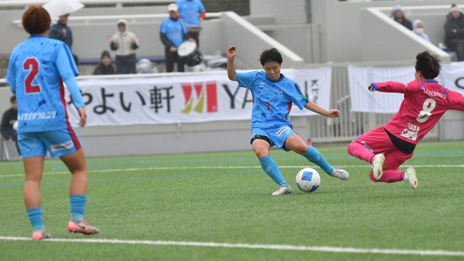 つくばFCレディースは前半5分、南葛の菅野永遠から右コーナーキックを直接決められ、失点する。つくばも4分後、石黒璃乙が中央からドリブルで突破してシュートを放つが得点ならず。石黒は高校卒業後の今季から新加入しチーム最多得点を挙げている。