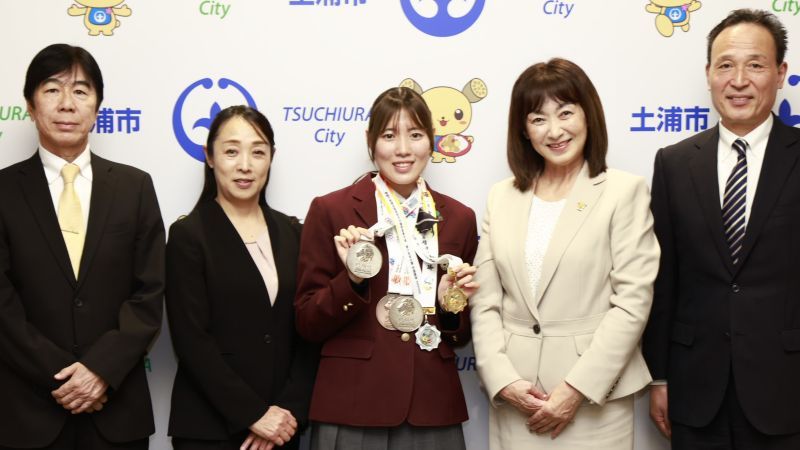 常総学院高校(土浦市)水泳部3年の中澤心暖(こはる)選手が、8月の全国高校総体女子200メートル平泳ぎで大会新記録で優勝、9月にインドで開催された水泳のアジア選手権で三つのメダルを獲得するなど輝かしい成績を残した。24日に土浦市の安藤真理子市長らを表敬訪問しこれまでの成績を報告。安藤市長は「今後の活躍に期待します」などと激励した。