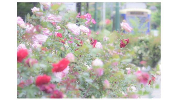 作品「バラ色の路面電車」で、せきさんが取り上げたのは都電荒川線。荒川区は40年ほど前からバラを使った緑化運動に取り組んでおり、撮影地の荒川2丁目停車場付近では、線路沿いに整備された花壇にさまざまな種類のバラが咲き誇る。「バラの花にカメラを向けるとその奥に、ゴトンゴトンと音を立てながら都電がゆっくりとフレームに入ってくる。近くで撮ってもいかめしい感じにならないのが都電のいいところ」とせきさん。
