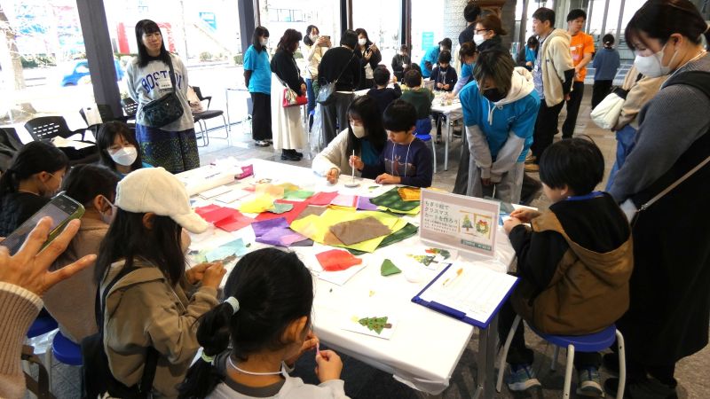紙パックを使った工作では、子供たちが、紙パックに布シートを貼り付けて、さらにクリスマスツリーのように飾り付けるバッグ作りに挑戦した。トイレットペーパーの芯では昆虫やコースターなどを作った。再生紙は、関彰商事の廃棄書類から作られた再生紙でクリスマスツリーに飾るオーナメントを作った。