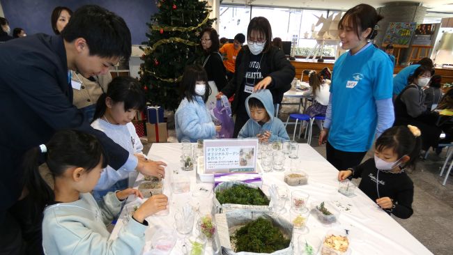 ほかに、筆で文字を書いたりスタンプを使ったりする「オリジナル年賀状づくり」、小さな透明な容器に砂や石などを敷きミニガーデンをつくる「テラリウムづくり」など計七つのブースが設けられた。