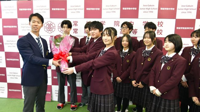 続いて中学校高校生徒会が花束を贈呈。高校生徒会長の中島サラ萌奈さん(2年)は、「自分たちの学校からこのような素晴らしい先輩が出たのはすごいこと。これからも大変なことはいっぱいあると思うが、私たちが応援しているので頑張ってほしい」と思いを述べた。
