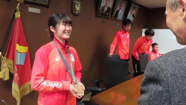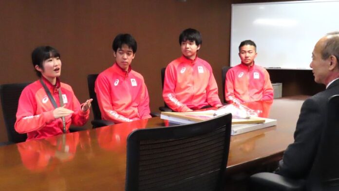 4人は星野選手のほか▽男子バレーボールで6位に入賞した4年 大坪周平選手(22)▽男子ハンドボールで7位に入賞した4年 林遼哉選手(21)▽陸上1500メートルと800メートルに出場した2年 中村大地選手(19)。日本代表の鮮やかなオレンジ色のジャージを着用し、星野選手は銅メダルを手にとって石原学長に見せるなどした。