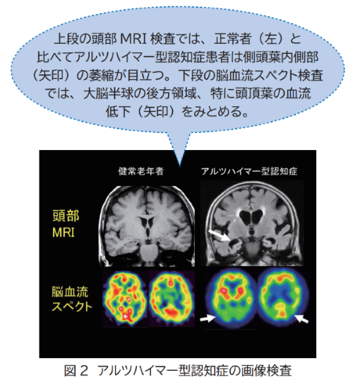 これらの疾患が該当しない場合は、頭部CTまたはMRIで脳の萎縮(やせ)や脳梗塞、脳出血などについてさらに詳しく評価し、その結果アルツハイマー型認知症またはレビー小体型認知症が疑われる場合は、最終診断のために脳血流スペクト検査に進みます(図2)。この検査は脳の機能を画像化および定量化するものです。レビー小体型認知症の診断のためには、必要に応じて「MIBG心筋シンチ検査」「DATスペクト検査」という検査を追加します。