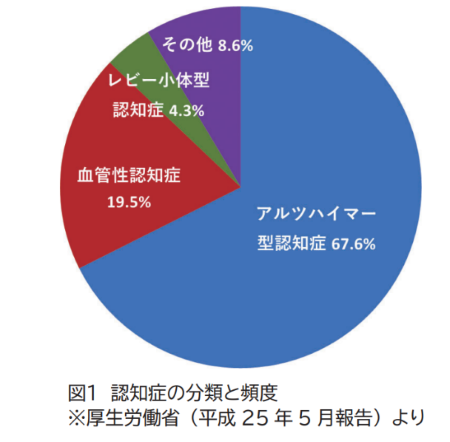 認知症の原因となる疾患は、アルツハイマー病(アルツハイマー型認知症)、レビー小体病(レビー小体型認知症)、脳梗塞や脳出血などの脳血管障害の3つが大半を占めます(図1)。アルツハイマー病とレビー小体病は脳の神経細胞が緩徐(かんじょ)に変性し脱落していく病態です。アルツハイマー病は認知症の最も頻度の高い原因で、脳にアミロイドβという特殊なたんぱく質がたまり、それが神経細胞を破壊して、認知症の症状を出現させる病気です。