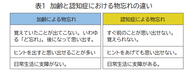 うつ病などの精神科の疾患や多くの高齢者に見られる加齢による物忘れは認知症ではありません。加齢による物忘れと認知症による物忘れは以下のように違います(表1)。