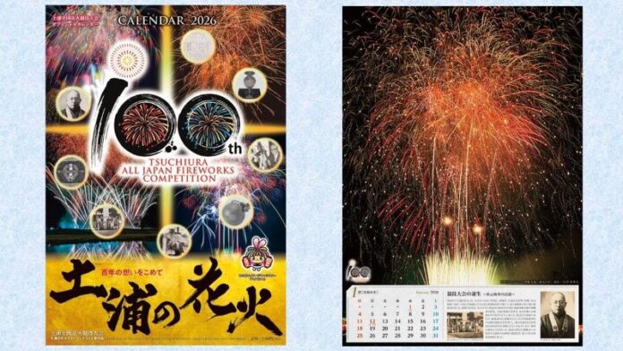 【コラム・小泉裕司】上の写真にあるオフィシャルカレンダー「100周年記念/土浦の花火カレンダー2026」の制作に当たっては、土浦全国花火競技大会実行委員会や土浦市立博物館とともに、私も企画監修に加わった。毎年、大会パンフレットを担当するいなもと印刷(土浦市板谷)のノウハウや熱い思いとコラボして、13枚組の重厚な仕様になった。