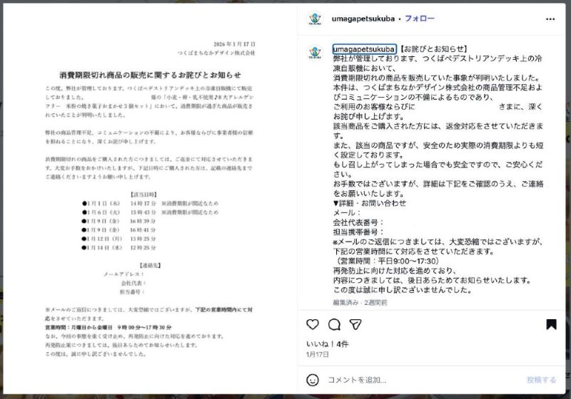 消費期限切れ食品の販売が発覚したのは1月17日。まちなかデザインは同日、「旨がっぺTSUKUBA」のインスタグラムとフェイスブックに掲載した同社名義の「消費期限切れ商品の販売に関するお詫びとお知らせ」で、問題が起きた経緯について「弊社による商品管理不足とコミュニケーションの不調」によるなどと説明し、返金対応を行うとした。同時に、自販機に貼り紙を貼り、購入者に連絡を呼び掛けている。一方で、食品の自販機の設置者であり、商品の管理責任を負うまちなかデザイン自身の公式ホームページや、会社のSNSアカウントでは、2月2日時点で、消費者に対する説明や購入者への呼び掛けは行われていない。