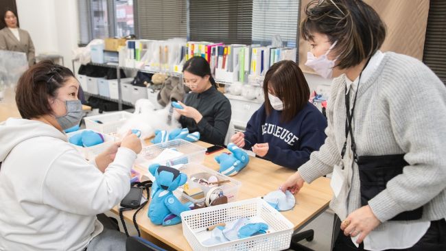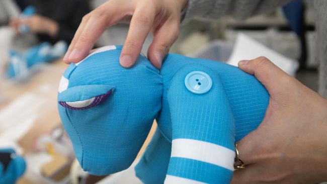特性の異なる生地を縫い合わせるために、複数の糸を使い分ける。縫製時には紙を挟んで伸びを抑えるなど工夫を重ねる。立体感を出すためにダーツを入れるなど、洋裁の専門知識も活かされている。背番号や色の切り替え部分をどこに使うか考える。1体ずつ表情が異なる「世界に一つだけのぬいぐるみ」だ。