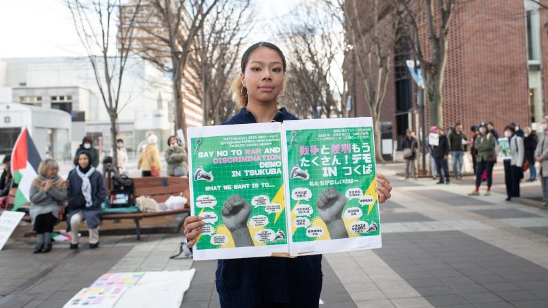 スタンディングデモを呼び掛けたのは、つくば市在住の大学院生、ハナさん(25)。日本とナイジェリアにルーツを持ち、つくばで生まれ育った。2週間前の衆院選で、与党の自民党が大勝した結果について、「自分にとっては衝撃的だった。食べ物は高く、賃金は低い。毎日生活が苦しい状況で、軍事費を上げようとする。日本が戦争に向かっているように感じた」と語る。