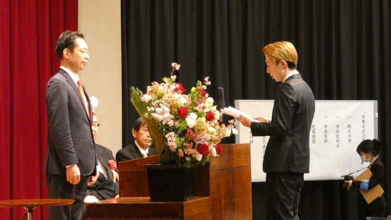 卒業生を代表して経営情報学部人文科学専攻の朝妻翔さん(22)は「大学の4年間で自分ができることは積極的に挑戦し、成長すること、そして一人で解決しようとするのでなく周囲の人の助けを借りることの大切さを学んだ。自分が気づかないことでも他の人の客観的な視点が必要なこともある。SNSやオンラインゲームで簡単に世界とつながれる時代だからこそ信頼できる関係を築くことが大事だと思う」と答辞を述べた。