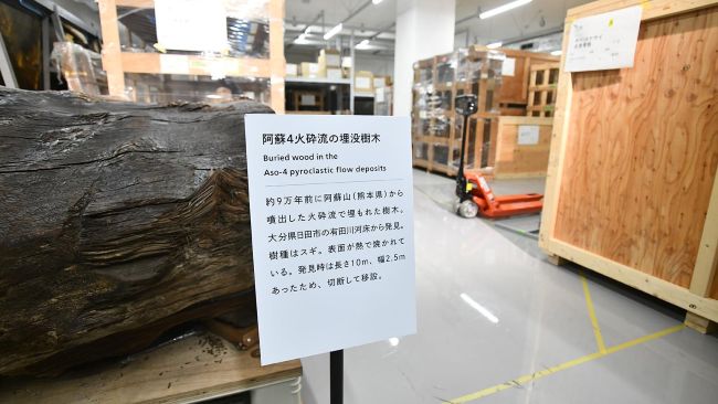 現在もほんのり木の香りが残る、約9万年前に阿蘇山の火砕流で埋没した直径2.5メートルのスギの木のほか、幅1.7メートルのヒノキ科の樹木メタセコイアの化石、かつて同博物館上野本館で展示されていた恐竜カンブトサウルスの全身骨格復元標本なども並ぶ。