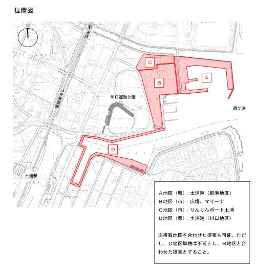 事業者を公募した整備区画は、▽A地区:湖底土砂浚渫(しゅんせつ)船などが利用する土浦港(県施設)▽B地区:マリーナ(ラクスマリーナのヨットなどの係留・管理施設)と広場(市施設)▽C地区:「りんりんポート土浦」(サイクリスト向け拠点施設)区画(市有地)▽D地区:プレジャーボートなどが停泊する土浦港(県施設)―で構成されるエリア。
