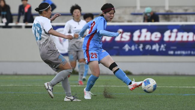 後半43分、途中出場のFW犬伏柊萌子がシュートを放つ