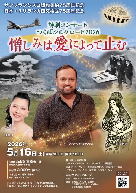 「憎しみは愛によって止む」は、ブッタの言葉をテ一マにした2部形式の詩劇コンサート。第1部「終わりの始まり」は、講和条約の話を舞踊と映像で構成する。第2部「平和の里を訪ねて」は、スリランカ共和国になった翌年1973年に生まれたクリシャンタさんの人生と同国の現代史を重ねて歌で構成する。