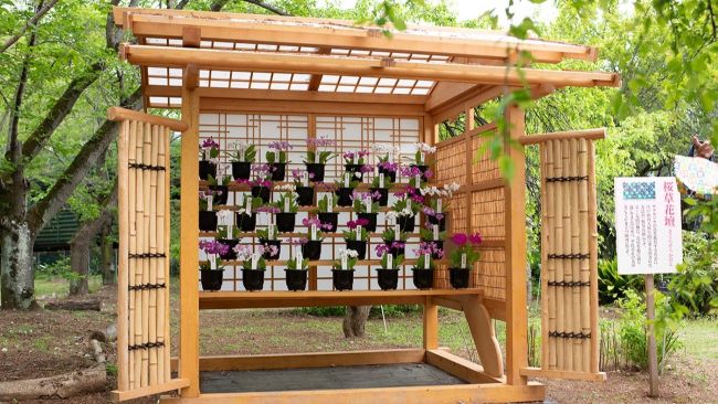 展示会場では、上部や背面をすだれで囲んだ3段から4段の木製縁台に、鉢植えのサクラソウが並べられる。江戸時代に観賞用に用いられた「桜草花壇(さくらそうかだん)」を再現したものだ。当時の文献や図面をもとに、上段には下向きの花、下段には上向きの花を置くなど、見る人の目線を意識した配置がなされている。すだれの隙間から差し込む光も含め、花壇全体で空間を演出する手法だ。