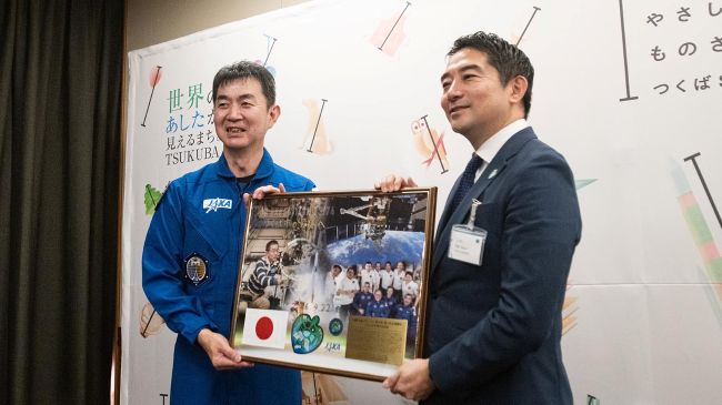 国際宇宙ステーション(ISS)に約5カ月間滞在し、今年1月に帰還した宇宙航空研究開発機構(JAXA)の宇宙飛行士 油井亀美也さん(54)が22日、JAXAの宇宙飛行士養成施設がある地元のつくば市役所を訪れ、五十嵐立青市長を表敬訪問した。今回の油井さんの宇宙滞在は2015年以来、約10年ぶり2回目で、滞在日数は合計300日を超えた。「つくば市民の応援が大きな励みになった」と語った。